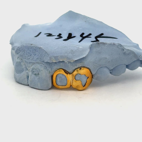 Make a global statement with this bold and artistic accessory. The Custom 2 Teeth Grillz feature a Open Face Continent Set design, showcasing finely detailed landmass contours that wrap around each tooth with precision. Accentuated by an Open Face Window style, this piece reveals part of the natural tooth for a sleek and modern contrast.